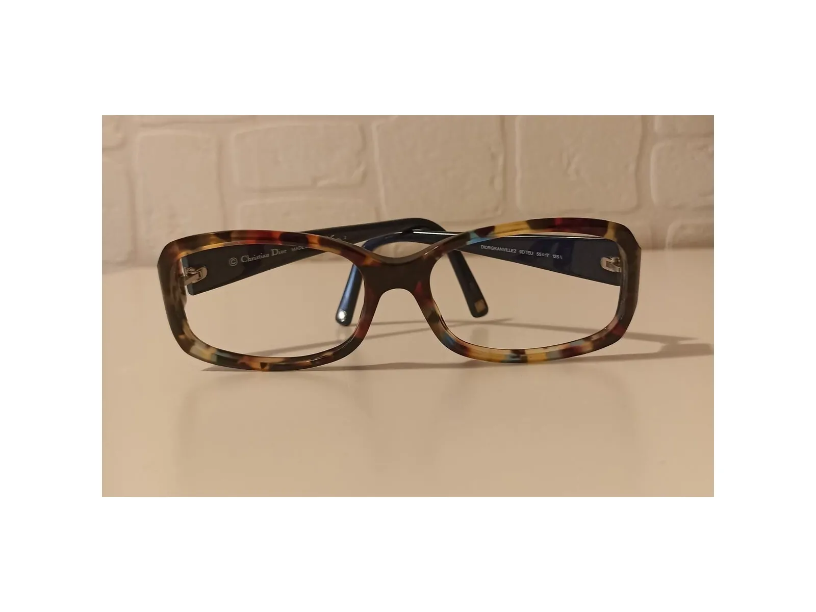 Devant la monture est motif écaille à dominance marron et bleu, les branches sont bleu foncé avec le logo DIOR.