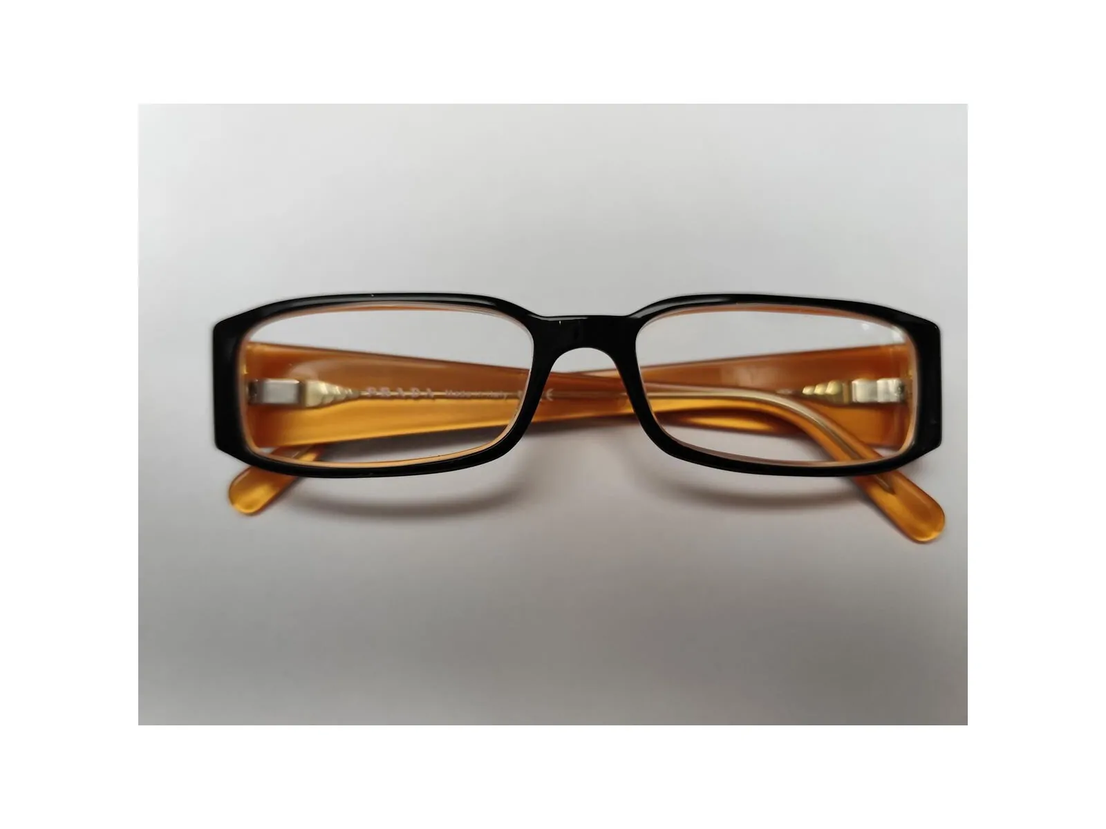 Monture forme rectangulaire noir des côtés sont à l'extérieur noir à l'intérieur orange sur chaque côté il est inscrit la marque Prada couleur argenté sur un fond noir avec nos trois petits carrés orangés épaisseur des branches au niveau des yeux 2 cm de chaque côté