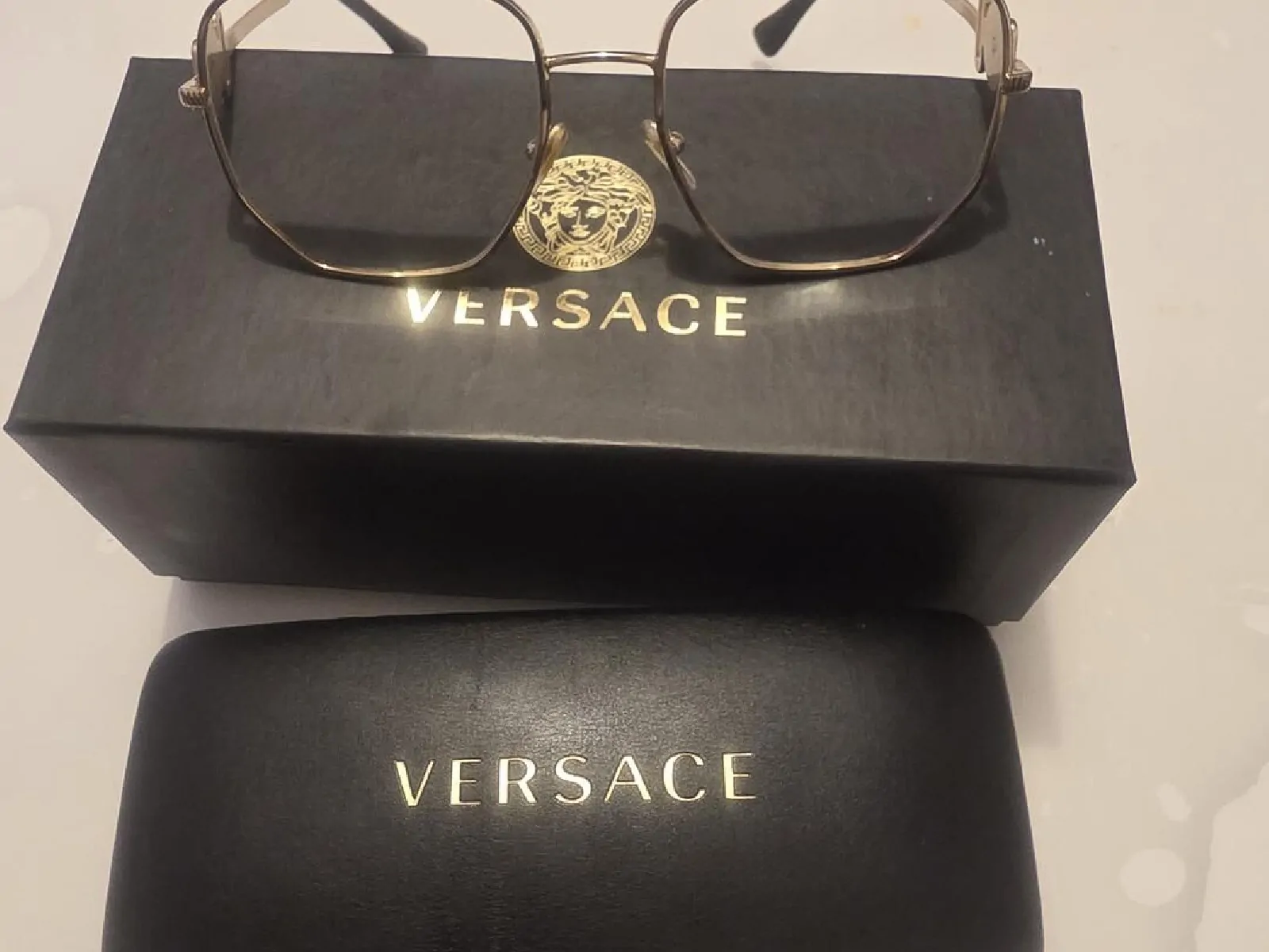 Détails : Monture fine en métal doré avec le logo emblématique de la marque sur les branches. Accessoires inclus : Vendues avec leur étui d'origine noir Versace et la boîte de protection assortie (visibles sur les photos). État : Très bon état général, monture bien entretenue.