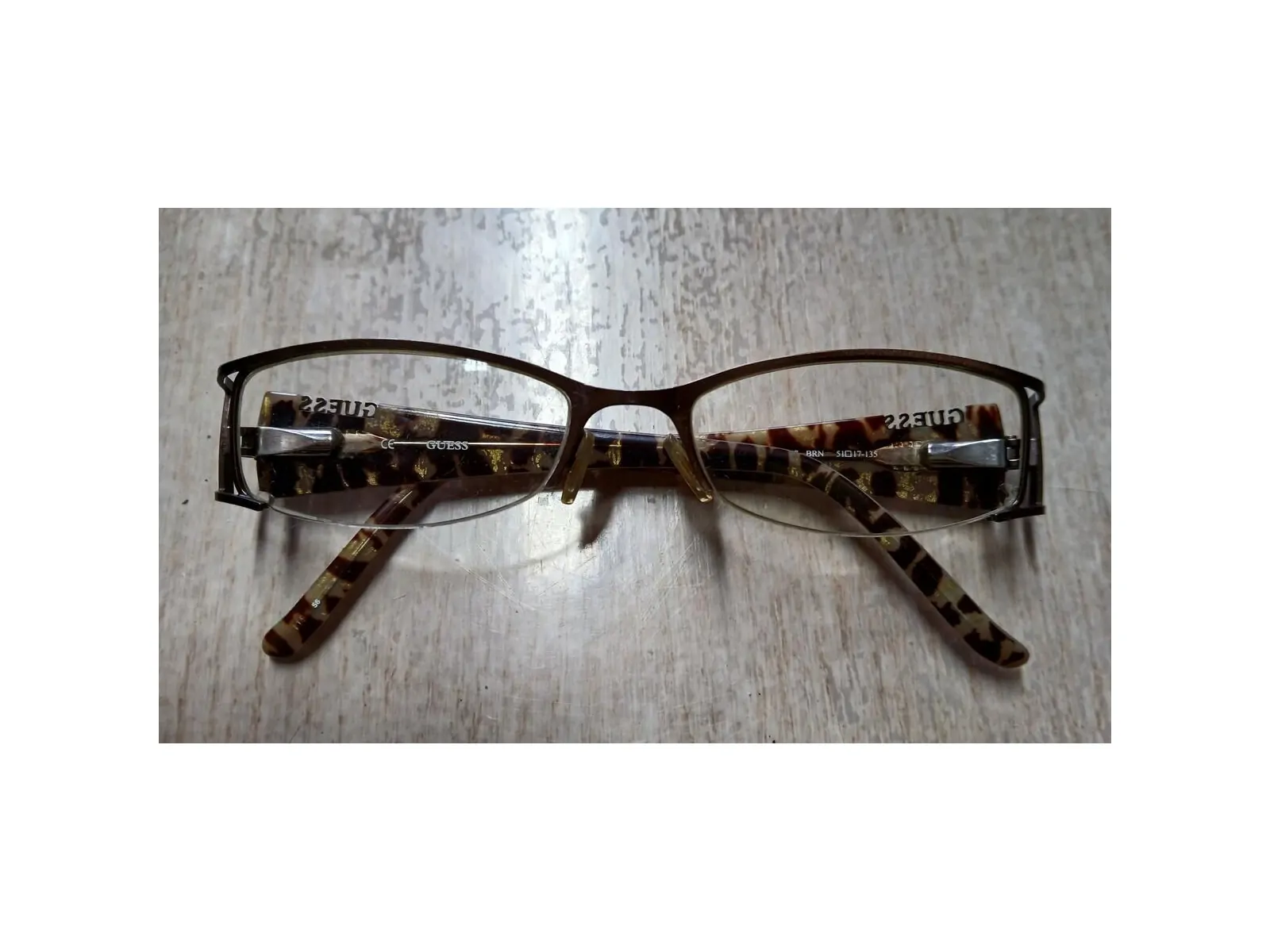 Ce sont une paire de lunettes de Marque GUESS, de couleur brun, les branche sont en résine, et la monture métallique, elle n'es ont pas entièrement fermée, les verres sont maintenu avec un lien transparent