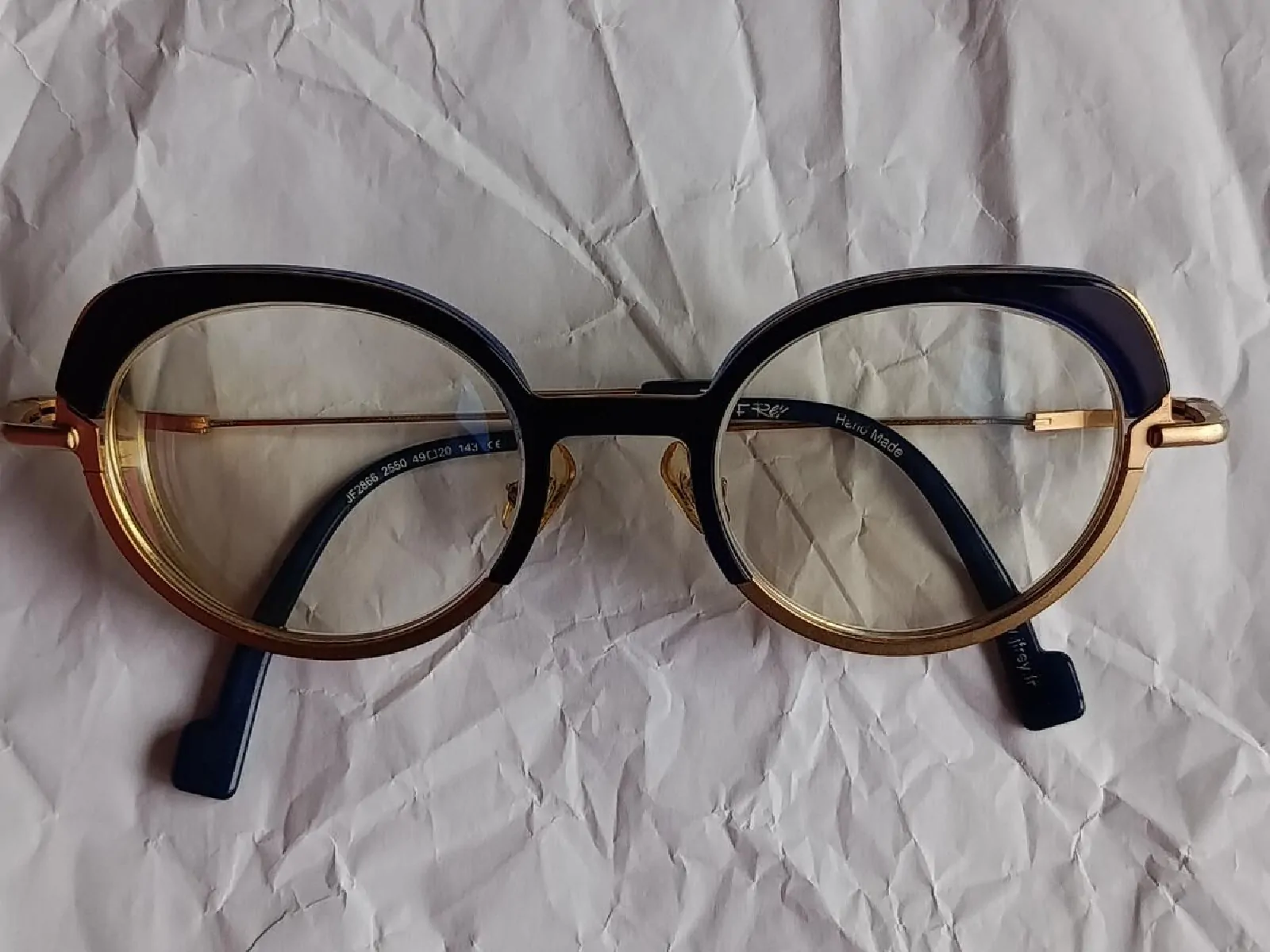 Monture en métal doré et plastique bleu outremer.