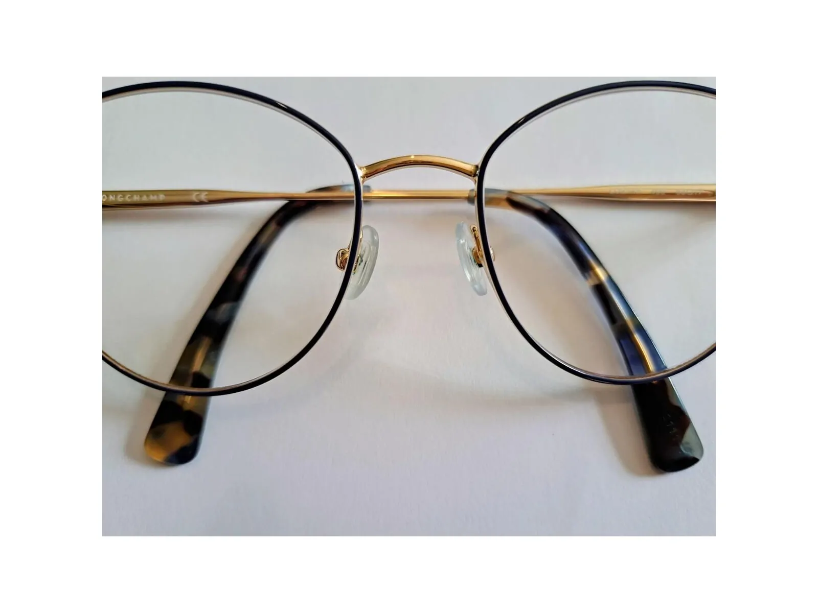 En métal, coloris doré. Bleu sur le contour des verres et nuancé de bleu également sur le bout des brabches.