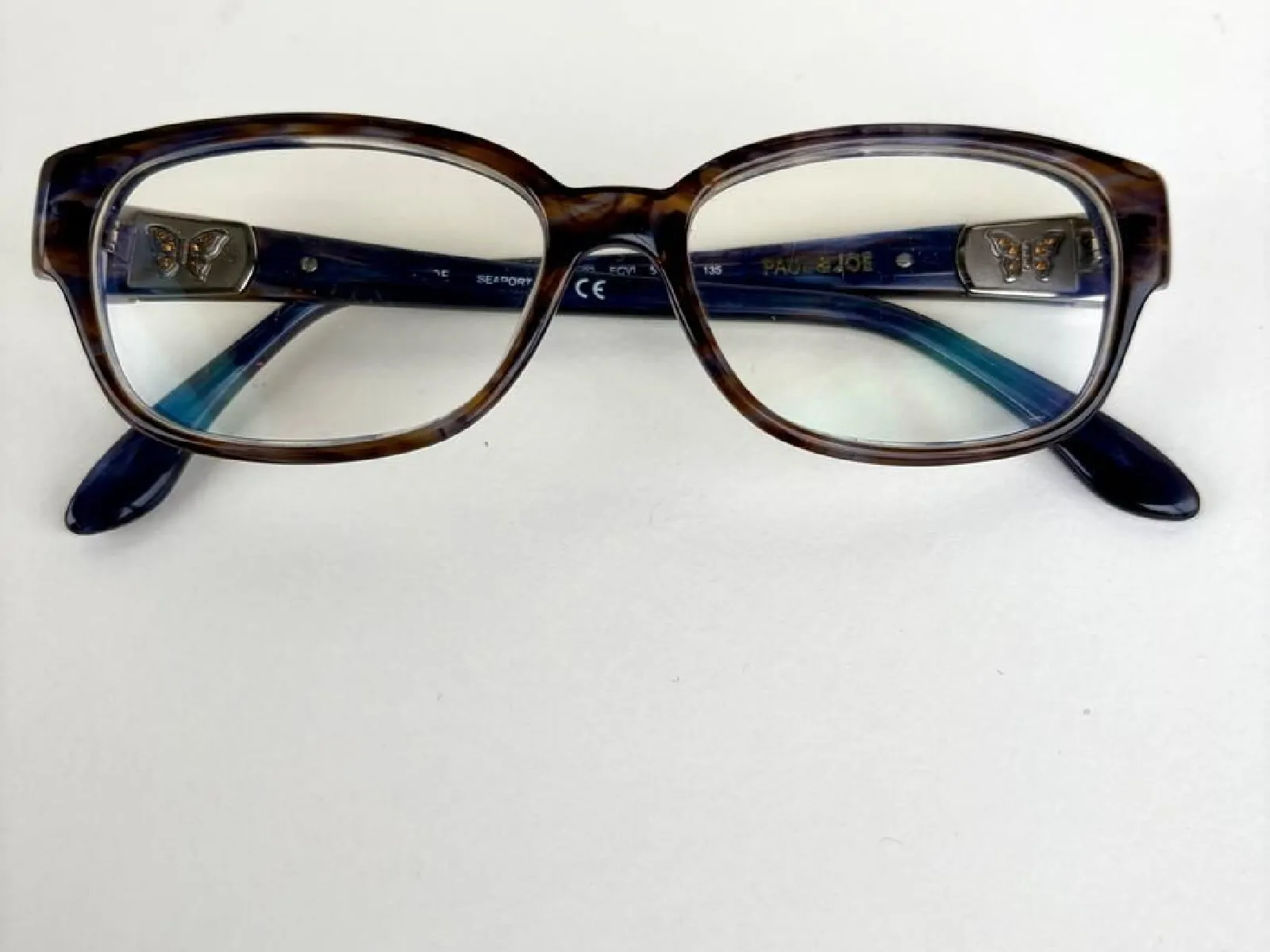 Design élégant en acétate écaille aux reflets bleutés , distingué par ses charnières bijoux en forme de papillons sertis de strass.
