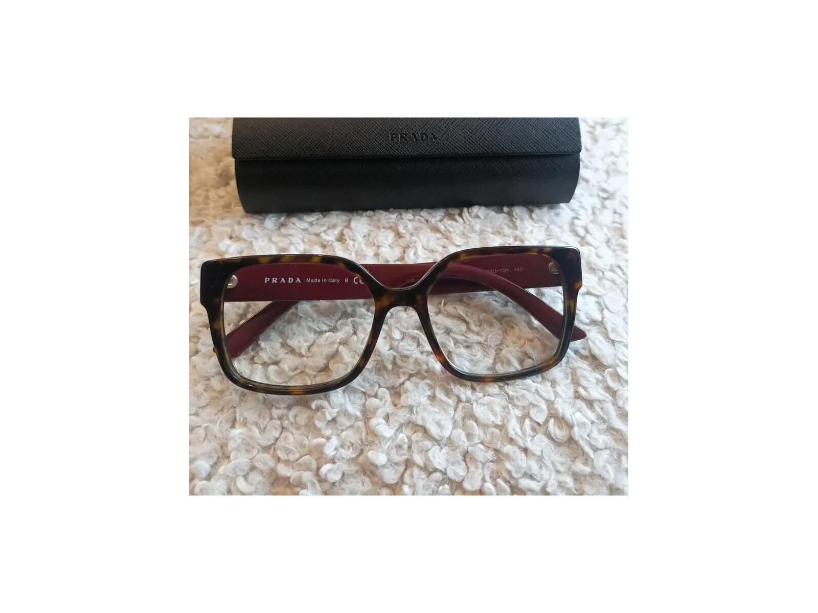 Monture Prada de couleur bordeaux et écailles quelques imperfections ça et là mais en bon état général.