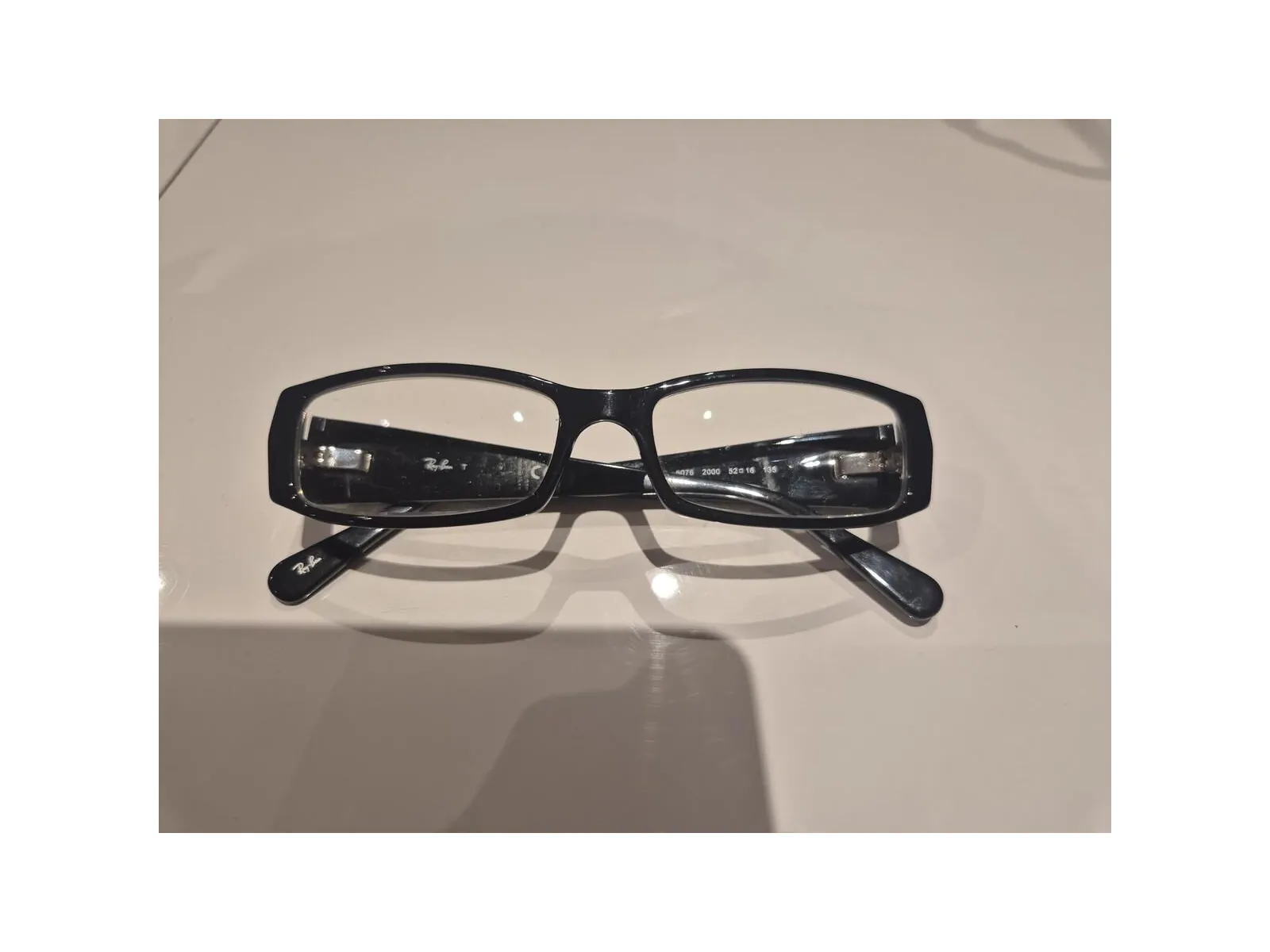 Lunettes de vue rectangulaire, monture noire en plastique brillant, branches plus larges au niveau des verres et qui s'affine vers les oreilles. Logo rayban sur chaque coté. Aucun défaut apparent sauf effet mat sir m arrière d une des 2 branches lié au "frottement" de l'autre branches en position fermée dans la boite.
