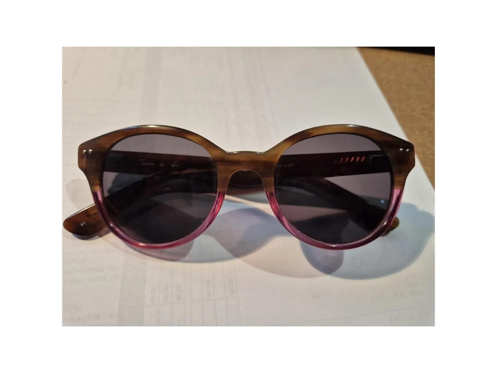 Modele genre ray ban mais beaucoup plus fun! Ecaille pour les branches et le haut de la monture et un joli rose flashy sur le dessous qui illumine le visage