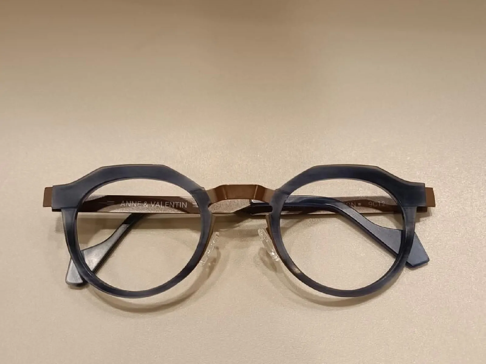Forme arrondie avec insert acétate bleu marine et marron.