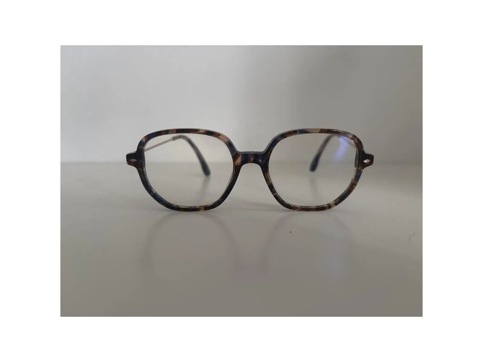 Monture de lunettes couleur écaille foncé avec des nuances de bleus.