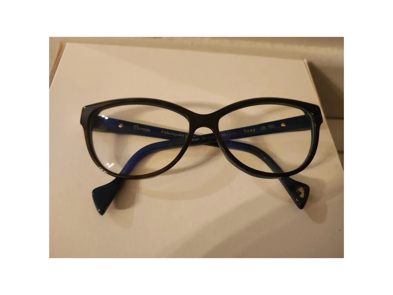 Fabriquée en France, très belle plaque d'acétate bi colore, chocolat sur la face de la monture, bleu canard intérieur monture et branches.