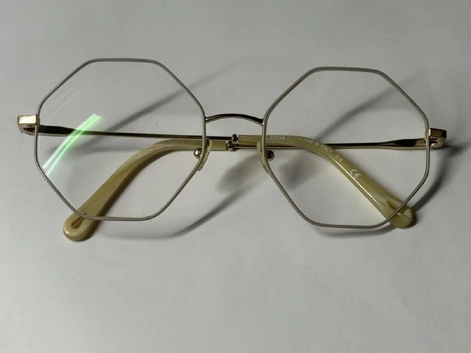 Cadre en métal fin doré, petit liseré beige devant qui adoucit le visage.