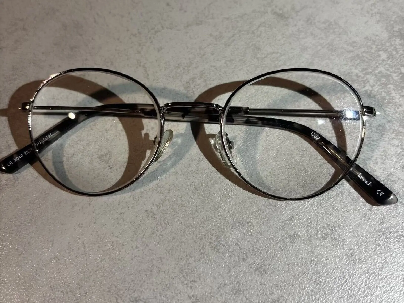 Monture de vue de la marque LEVEL en acier gris, branches mouchetées et au dessus du verre